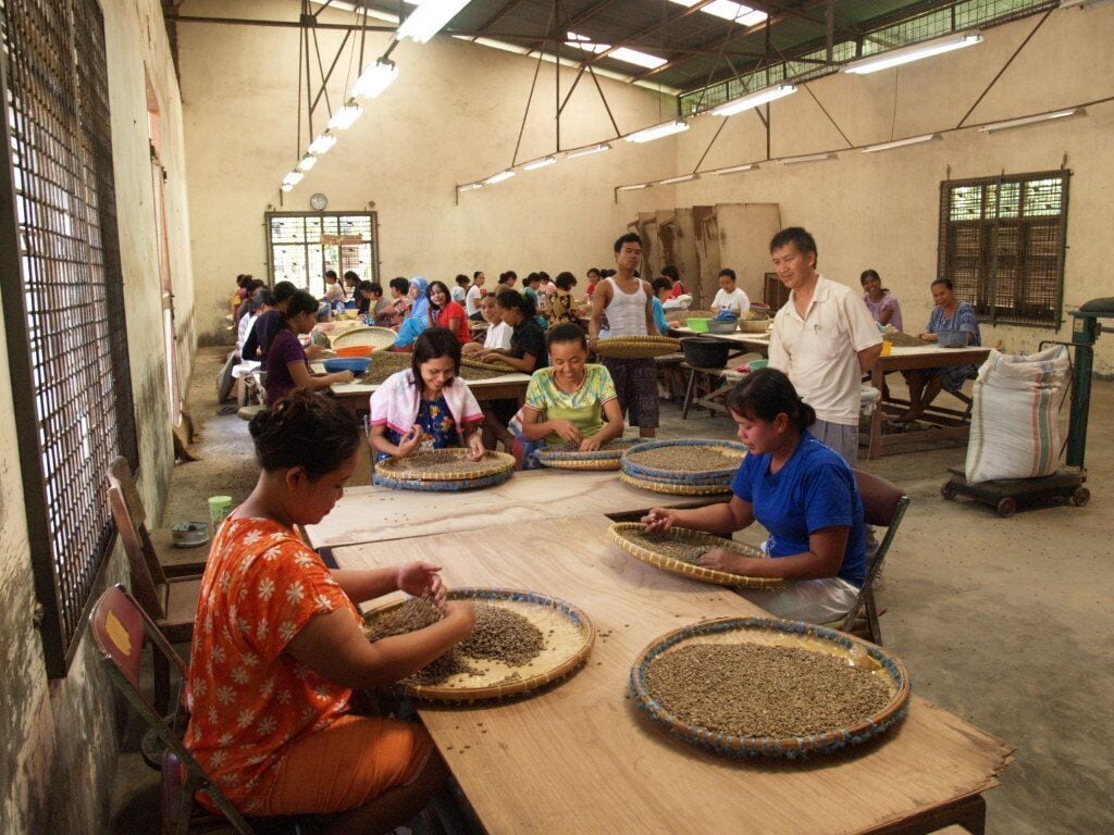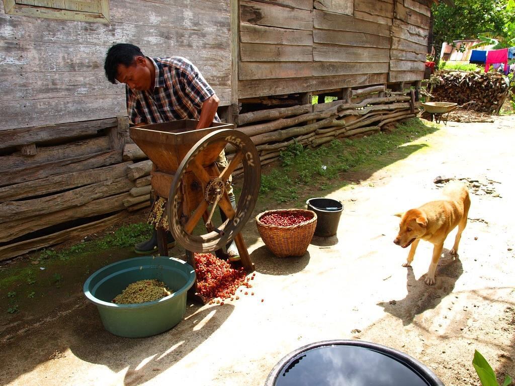 産地において果肉を剥いて水洗まで行ない、ウェットパーチメントの状態でメダンの輸出業者工場(エカヌサジャヤ社)へ気温の低い早朝の時間帯に輸送される。 乾燥 輸出業者に入荷された原料はその日のうちに加工される。